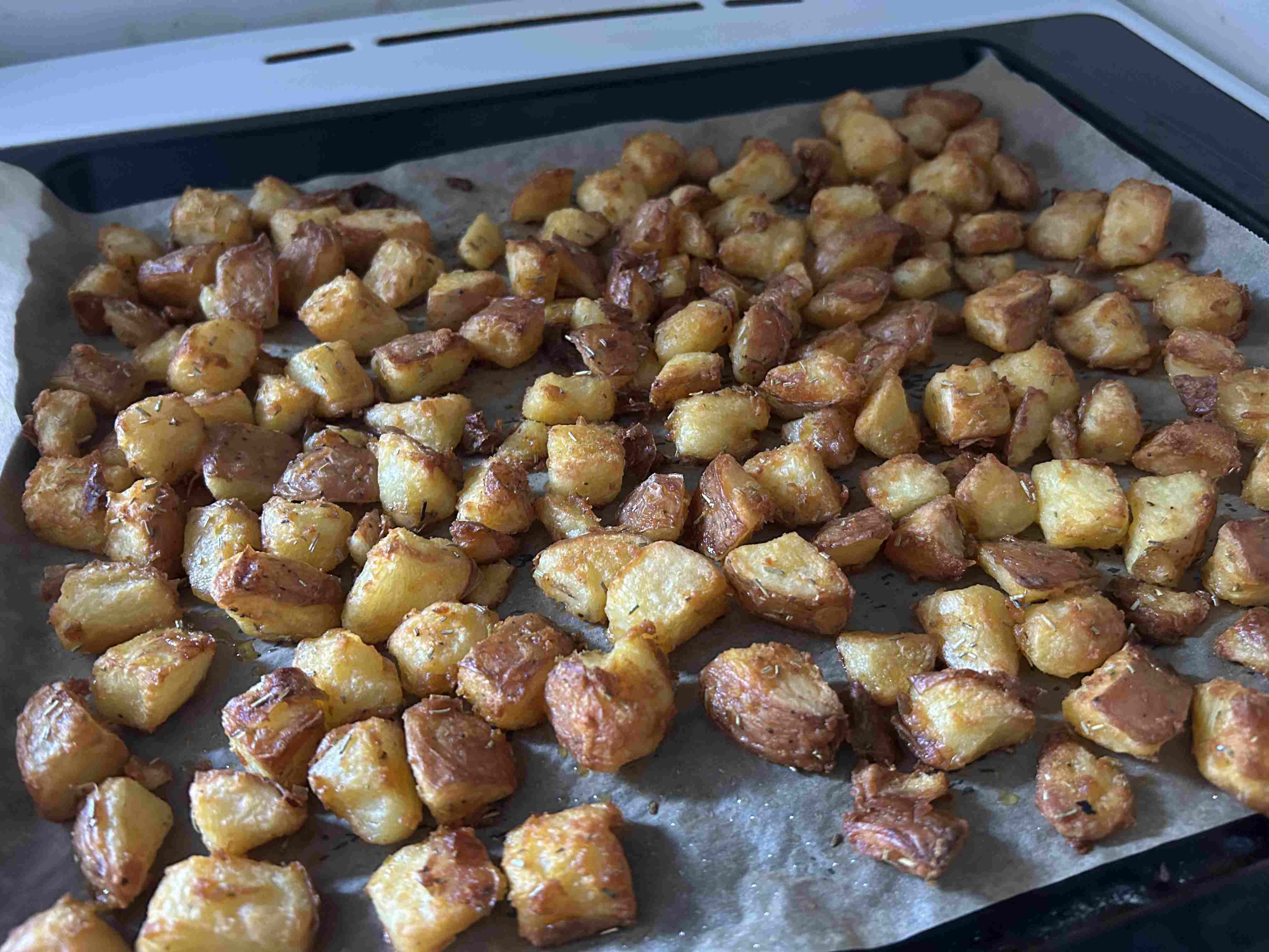 Kartoffeln in Mundgerechte Würfel schneiden und in Salzwasser für ca. 8 - 10 Minuten kochen. Die Außenseite der Kartoffelstücke sollte weich, der Kern aber noch hart sein. Wasser abschütten und Kartoffeln mit offenem Deckel für 5 Minuten abkühlen bzw. trocknen lassen. Topf mit Kartoffeln und Deckel schütteln, sodass die Oberfläche der Stücke angeraut wird. Öl, Rosmarin, Paprikapulver und Salz hinzugeben und alles gut vermengen. Kartoffeln auf einem Backblech verteilen und bei 160°C für 45 - 60 Minuten backen. Jeweils nach 15 bis 20 Minuten sollten die Kartoffeln gewendet werden, damit sie rundum knusprig werden.